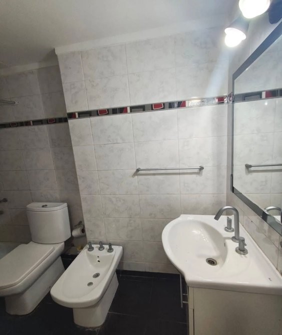 El baño posee receptáculo de ducha, inodoro, bidet y vanitory.